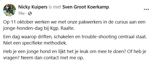 Pakwerk Jonge-Hondendag bij Kringgroep Raalte, met Nicky Kuipers en Sven Groot Koerkamp. (Pakwerkcursus les 4)